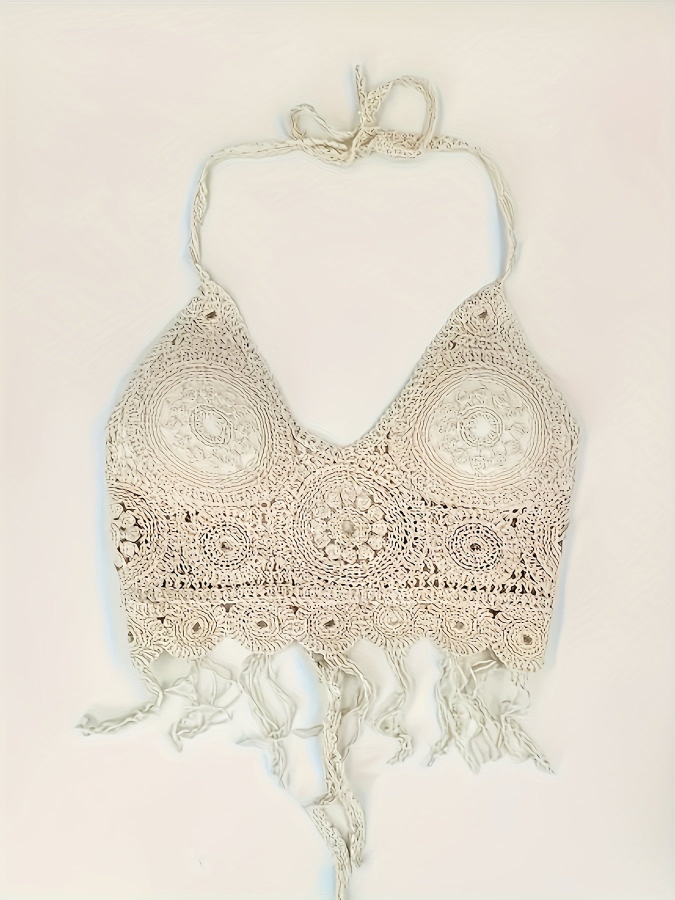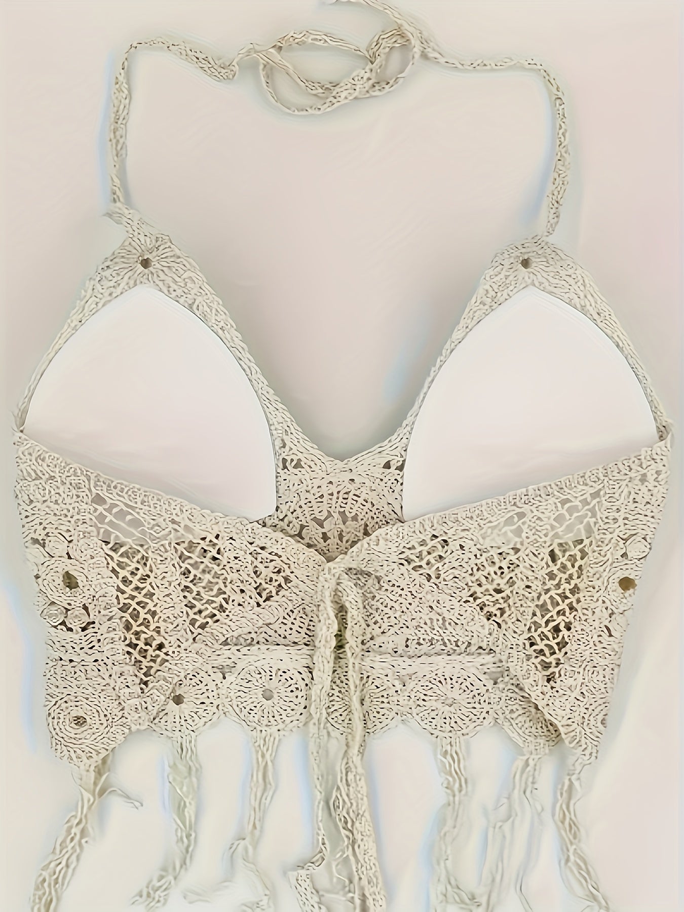 • Features: Open-work crochet design, halter neck, bust pads, lightly elastic fabric
