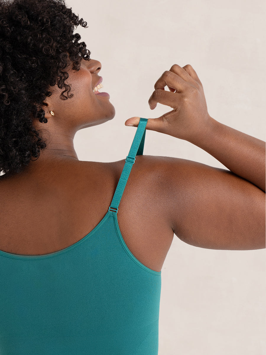 • Design: Deep round neck, adjustable straps, seamless